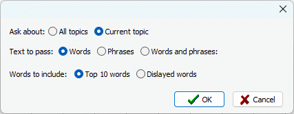 Les requêtes IA en modélisation de thèmes ont été étendues afin de permettre l’analyse soit du thème sélectionné, soit de l’ensemble des thèmes simultanément. Les requêtes peuvent également être limitées à des sous-ensembles de mots — tels que les mots affichés, les termes les plus fréquents ou les phrases suggérées — offrant ainsi un moyen plus ciblé d’examiner la manière dont les thèmes et les catégories sont définis dans le corpus.