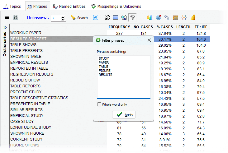 Le panneau d’assistance au dictionnaire utilisé pour évaluer les interactions entre les entrées du dictionnaire et évaluer l’impact des caractères génériques inclut maintenant la possibilité d’afficher la fréquence des mots correspondant au motif sélectionné dans l’ensemble de données actuel. De plus, les entrées du panneau peuvent être filtrées pour ne montrer que les éléments présents dans l’ensemble de données, rationalisant le processus d’analyse.