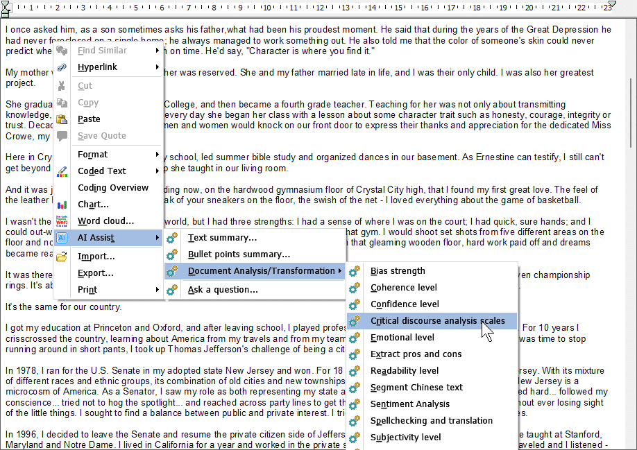 We evaluated a wide range of AI-driven features and integrated those that offered strong performance, while carefully balancing processing speed and cost. Among the most effective are sentiment analysis, pros and cons extraction, spelling correction, and automatic translation, all of which produce highly accurate results across most AI engines. We also introduced AI-assisted readability scoring, lemmatization, segmentation for Asian languages (Chinese, Japanese, Thai, etc.), and grouping of Vietnamese monosyllabic tokens. Additionally, users can create their own data transformation or analysis scripts, extending QDA Miner’s capabilities in ways limited only by their imagination, and, of course, by the current boundaries of generative AI.
