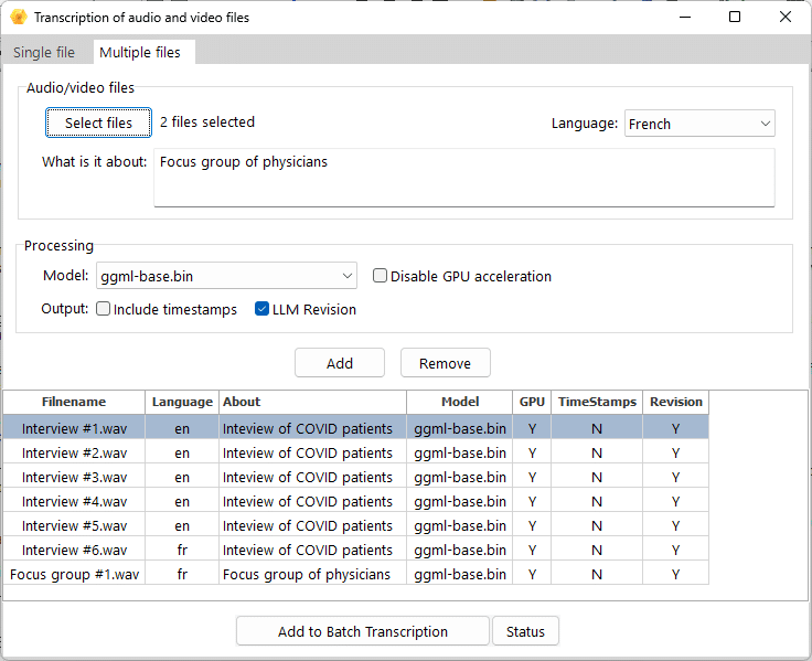 Transcriptions are handled by an independent background process that allows you to queue multiple files and continue working in QDA Miner, switch projects, or even close the software entirely. If your computer is restarted before completion, unfinished jobs automatically resume when the system restarts.